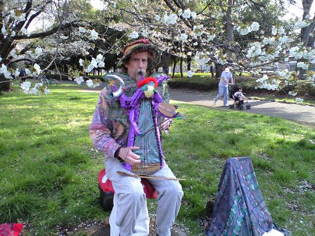 手作り楽器を弾いてる人(写真)にも出会った。